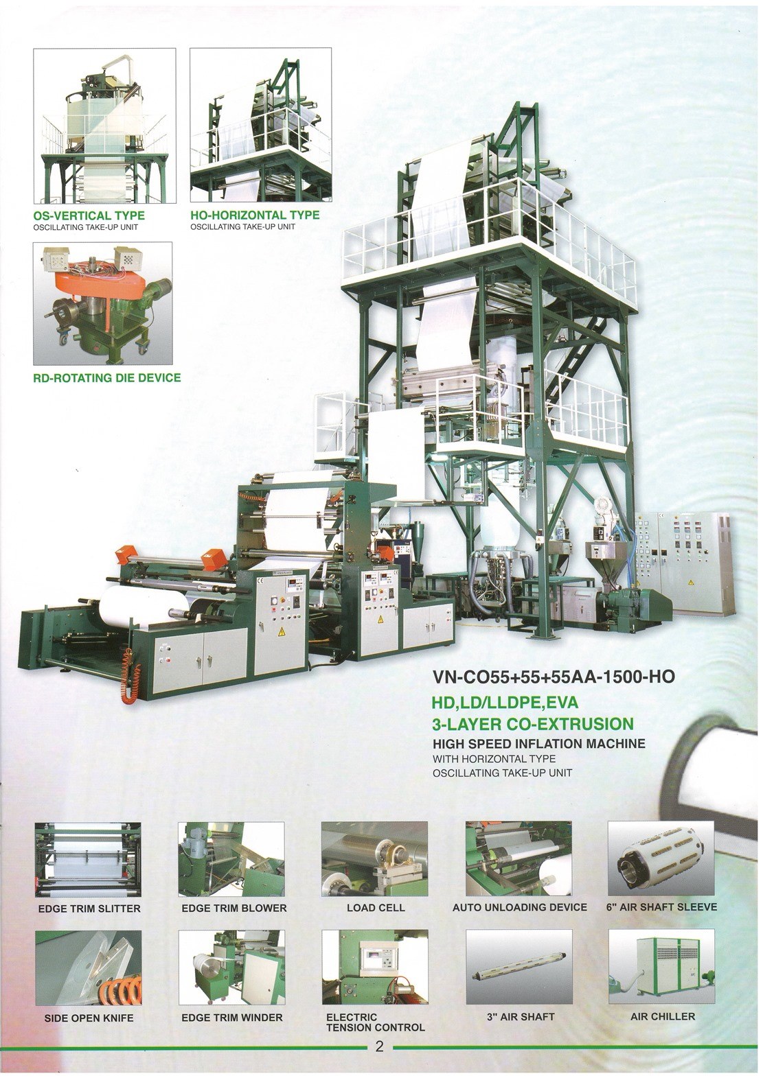 High speed inflation machine with horizontal type oscillating take-up unit.